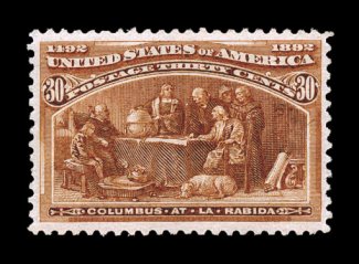 185 nh 239 image#239, 30c Columbian, pristine mint single, uncommonly well centered and margined, strong rich color and a highly detailed impression, o.g., n.h., extremely fine; 1998 PF certificate. (Image) $900.00