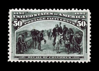 186 nh 240 image#240, 50c Columbian, an especially choice mint single, possessing a remarkable brilliance few others enjoy, with stunning color that is especially deep and intense, prooflike impression on fresh untoned paper, additionally it is marvelously well centered amid uncharacteristically wide margins, unblemished o.g., n.h., extremely fine; a terribly difficult stamp to find in this outstanding never hinged condition; 2000 PF certificate. (Image) $1,750.00