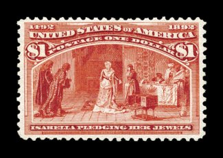 187 nh 241 image#241, $1.00 Columbian, deep "fiery" color and an especially strong impression, well centered and margined, o.g., n.h., very fine; true never hinged examples of the One Dollar Columbian are seldom offered; 2002 PF certificate. (Image) $3,750.00