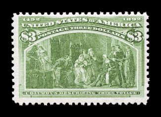 189 nh 243 image#243, $3.00 Columbian, exceedingly bright and fresh mint single, with lovely rich color and a clean impression, attractively centered and margined, o.g., never hinged (quite rare thus), very fine; 2001 PF certificate. (Image) $6,000.00