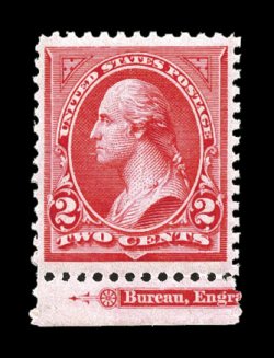 193 nh 251 image#251, 2c Carmine, Ty. II, highly select bottom margin partial imprint single, exceedingly well centered, marvelously bright and fresh, pristine o.g., n.h., extremely fine gem; a rare and difficult stamp to find in this premium never hinged condition; 2002 PF certificate for a strip of three, this being the left stamp. (Image) $1,100.00
