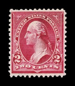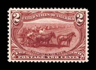 227 nhu 286 image#286, 2c Trans-Mississippi, excellent centering within large margins, gorgeous color that is especially rich and vibrant, sharp impression, pristine o.g., n.h., extremely fine; 2004 PSE certificate (XF 90; SMQ $255.00). (Image) $75.00