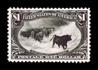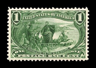 233 nh 292 image#292, $1.00 Trans-Mississippi, an incredibly handsome "post office" fresh mint example, marvelously well centered within very large margins, especially intense "jet" black color and a well incised impression on crisp paper, immaculate o.g. without a single gum bend or skip, never hinged, extremely fine; choice never hinged examples of this popular commemorative are few and far between; 2003 PF certificate. (Image) $3,500.00