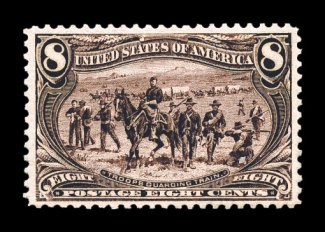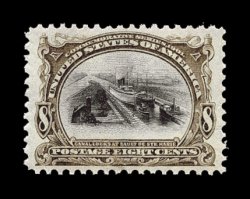 230 nh 289 image#289, 8c Trans-Mississippi, well centered within much larger margins than normally found on this difficult value, sumptuously rich color and a deeply etched impression, unblemished o.g., n.h., extremely fine; 2002 PF certificate. (Image) $550.00