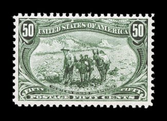 232 nh 291 image#291, 50c Trans-Mississippi, exceedingly fresh, with lovely rich color and a crisp detailed impression on clean white paper, attractively centered within large margins, o.g., n.h., very fine; an elusive stamp to find never hinged; 2004 PF certificate. (Image) $2,000.00