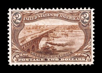 234 nh 293 image#293, $2.00 Trans-Mississippi, a most impressive mint example of this scarce and popular high value commemorative, possessing excellent centering within wide margins which are most uncharacteristic, sumptuously rich color and an unusually strong impression, fresh clean o.g., n.h., very fine; one of the very few certified never hinged Two Dollar Trans-Mississippis we have ever offered, and perfect for the collector seeking commemoratives in only choice never hinged condition; 2001 and 2005 PF certificates. (Image) $6,250.00