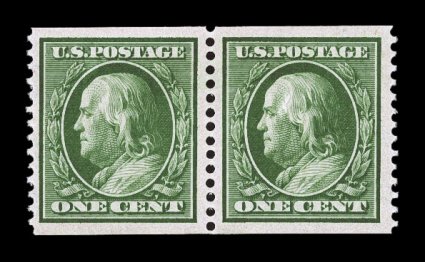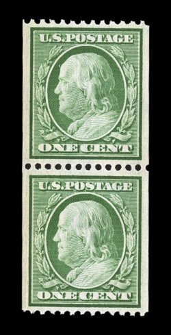 275 nh 348 image#348, 1c Green coil, perf. 12 horiz., choice quality mint pair, extraordinarily well centered, bright rich color, pristine o.g., n.h., extremely fine; 2000 PF certificate. (Image) $210.00