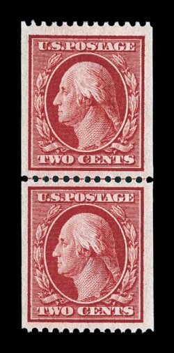 276 og 349 image#349, 2c Carmine coil, perf. 12 horiz., guide line pair, exceedingly well centered within remarkably large margins, deep "fiery" color and a crisp impression, o.g., top stamp lighlty hinged, bottom stamp never hinged, extremely fine; an elusive line pair, especially this well centered and margined; 1996 and 2004 PF certificates. (Image) $550.00