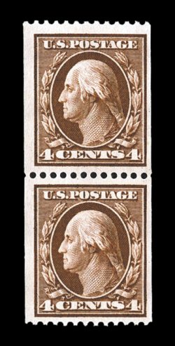 277 og 350 image#350, 4c Orange brown coil, perf. 12 horiz., pair, strong rich color and a sharp impression on bright white paper, well centered and margined, o.g., lightly hinged, very fine; 2002 PF certificate. (Image) $370.00