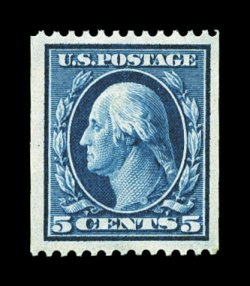 278 nh 351 image#351, 5c Blue coil, perf. 12 horiz., an impressive mint single, wonderfully well centered amid lavishly large margins which are most uncharacteristic of a genuine coil, deep vibrant color and and intense impression on clean white paper, unblemished o.g., n.h., extremely fine gem; 2005 PF certificate. (Image) $375.00