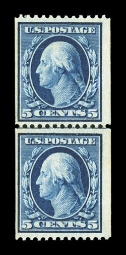 279 nh 351 image#351, 5c Blue coil, perf. 12 horiz., scarce guide line pair, nicely centered within large margins, strong color and impression, o.g., n.h., very fine; 1991 and 2000 PF certificates. (Image) $2,750.00