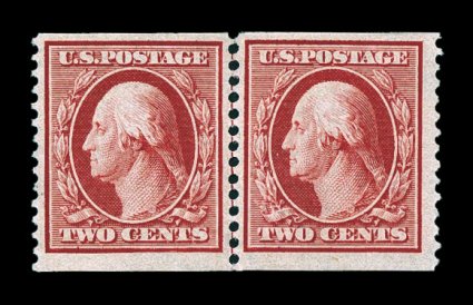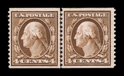 282 nh 354 image#354, 4c Orange brown coil, perf. 12 vert., guide line pair, well centered and margined, strong rich color and a highly detailed impression, immaculate o.g., n.h., very fine; a very scarce line pair, especially being both never hinged and certified; 2004 PF certificate. (Image) $3,250.00
