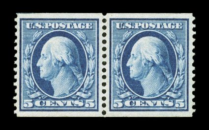 283 nh 355 image#355, 5c Blue coil, perf. 12 vert., mint pair, very well centered (especially the right stamp), bright fresh color on pristine white paper, flawless o.g., n.h., very fine-extremely fine; 2001 PF certificate. (Image) $1,250.00