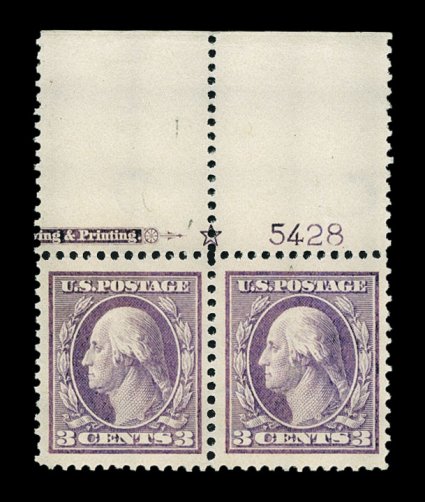 295 og/nh 376 var. image#376 var., 3c Lilac, top margin imprint and plate no. 5428 pair, with extra-large selvage, exceedingly well centered within very large margins, bright fresh color in the scarcer lilac shade, left stamp never hinged, right stamp very lightly hinged, extremely fine; 2005 PF certificate. (Image) $78.50+