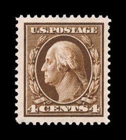 296 nh 377 image#377, 4c Brown, marvelously well centered amid enormously large margins, especially deep and luxuriant color, o.g., n.h., extremely fine; a striking jumbo; 1991 PF certificate for a horizontal pair, this being the right stamp; ex-Lessin. (Image) $67.50