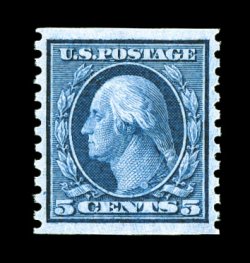 364 nh 458 image#458, 5c Blue rotary plate coil, perf. 10 vert., gem mint single that is precisely centered, deep luxuriant color and a razor-sharp impression, unblemished o.g., n.h., extremely fine; 2004 PF certificate. (Image) $65.00