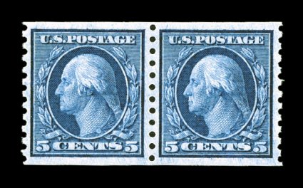 365 nh 458 image#458, 5c Blue rotary coil, perf. 10 vert., mint pair, excellent centering, especially strong rich color and a highly detailed impression on fresh white paper, o.g., n.h., extremely fine and choice; 1997 PF certificate. (Image) $375.00