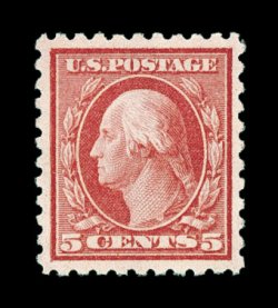 374 nh 467 image#467, 5c Carmine error, unusually well centered within large margins, strong rich color and a crisp impression, unblemished o.g., n.h., extremely fine; an impressive example of this scarce and popular error; 2000 PF certificate. (Image) $1,000.00