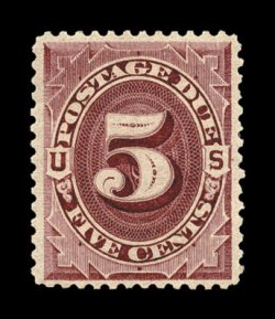 452 nh J34 image#J34, 5c Deep claret, excellent centering within particularly wide margins, rich color and a sharp impression on bright paper, o.g., n.h., choice very fine; a scarce stamp in this premium never hinged condition; 2003 PF and PSE certificates. (Image) $750.00
