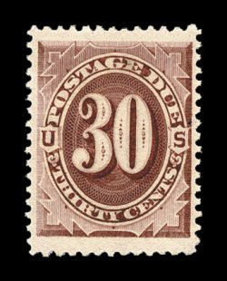 445 nh J20 image#J20, 30c Red brown, crisp mint single, with strong rich color and a well incised impression on fresh paper, well centered within unusually large margins, o.g., n.h., very fine; 1991 and 2004 PF certificates. (Image) for hinged $200.00