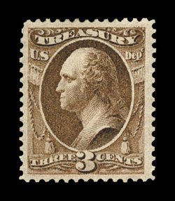 501 og O74 image#O74, 3c Treasury, uncharacteristically well centered within extraordinarily large margins, fresh color, o.g., lightly hinged, extremely fine and choice; 2005 PF certificate. (Image) $60.00