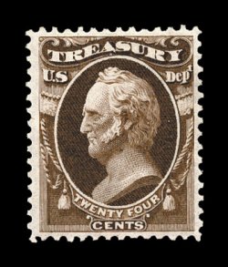 502 og O80 image#O80, 24c Treasury, deep intense color and impression on brilliantly white paper, nicely centered, full o.g., lightly hinged, choice very fine; 2004 PF certificate. (Image) $550.00