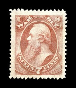 503 og O87 image#O87, 7c War, an incredible jumbo mint single, featuring gigantic margins all around and being quite well centered within this vast expanse, lovely rich color and a clean impression on fresh white paper, o.g., lightly hinged, extremely fine and striking; 2001 PF certificate. (Image) $130.00