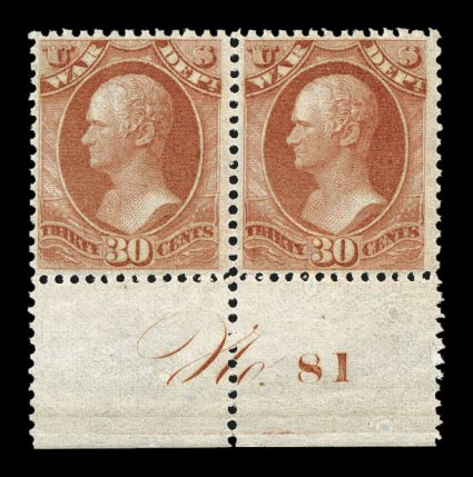 506 nh O92 image#O92, 30c War, bottom margin plate "No. 81" pair, especially rich color, o.g., never hinged, very fine overall; a handsome position piece; 2005 PF certificate. (Image) for hinged $120.00+