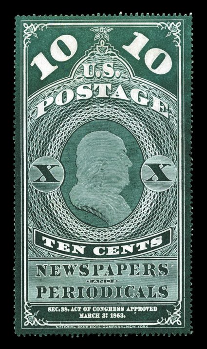 511 ogu PR6 image#PR5, 10c Dark bluish green reprint, without gum as issued, very well centered and margined, deep rich color and an unusually strong impression, extremely fine; actually quite elusive in this premium grade; 2004 PF certificate and a 2005 PSE certificate (VF-XF 85; SMQ $380.00); only one grades higher. (Image) $165.00