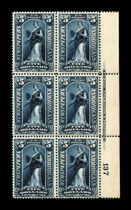 524 nhPB PR121 image#PR121, $5.00 Dark blue, right margin imprint and plate no. 137 block of six, deep prooflike color and impression, exceptionally well centered, fresh clean o.g., n.h., very fine-extremely fine; 2004 PF certificate; plate blocks are not listed in Scott, cataloged as six singles. (Image) $510.00+