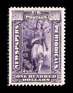 523 og PR109 image#PR109, $5.00 Ultramarine, an eye-catching mint example of this very scarce newspaper stamp, featuring spectacular prooflike color and impression on immaculate white paper, exceptionally well centered within wide margins, o.g., minor h.r., very fine; 2004 PF certificate. (Image) $2,000.00