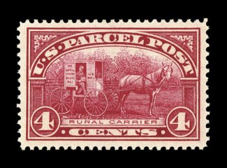 528 nh Q4 image#Q4, 4c Parcel Post, exceedingly large and wonderfully well balanced margins, radiant color and a sharp impression on bright white paper, immaculate o.g., n.h., extremely fine gem; 1992 and 2003 PF certificates. (Image) $110.00