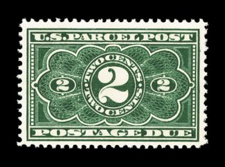 535 nh JQ2 image#JQ2, 2c Parcel Post Postage Due, deep luxuriant color and a razor-sharp impression on especially bright paper, well centered within uncommonly large margins for this difficult stamp, unblemished o.g., n.h., choice very fine; photocopy of a 2003 PF certificate for a block of four, this being the top left stamp. (Image) $210.00