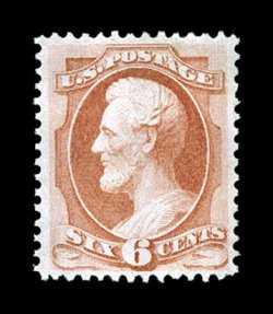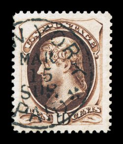 131 O 161 var. image#161 var., 10c Brown, on experimental silk paper, a breathtaking choice used example of this scarce and seldom offered variety, with every aspect of this stamp being sheer perfection, from its mathematically precise centering amid enormous jumbo margins, to its prooflike color and impression on bright white paper, even its cancellation is uncommonly scarce, being a superb strike of a New York Supplementary Mail type E postmark, clear evidence of silk threads in the paper, a superb gem example of this terribly undercataloged variety; 1992 PF certificate. (Image) $62.50