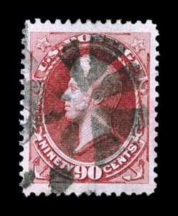 125 O 155 image#155, 90c Carmine, a highly desirable used single, being uncharacteristically well centered within much larger margins than typically found on this high value, deep vibrant color and a sharp impression, relatively light cork cancel, extremely fine; actually a very challenging stamp to find in this select used quality; 1998 PF certificate. (Image) $350.00