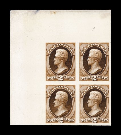 145 Pbl 193P4 image#193P4, 2c Black brown, plate proof on card, top left corner margin block of four, being positions 1-2, 11-12 from the unique sheet of 100, exceptionally bright and fresh, large margins, trivial corner crease at top left and a few stray marks at the extreme top of the selvage, neither are of any importance, extremely fine; only two values of the special printings (this 2c and the 3c) exist as plate proofs, both were in the Earl of Crawford and Ackerman collections, the 2c sheet was intact until 2004, when it was broken up into various size multiples; each handstamped "J.E. Lee" and with pencil position notations, as well as being accompanied by a photocopy of a 2001 PF certificate for the sheet. (Image) Est. 500-750
