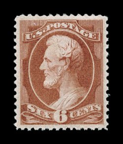 148 og 208a image#208a, 6c Brown red, a most impressive mint example, possessing large and perfectly balanced margins all around, plus its color is exceedingly deep and rich, while its impression in razor sharp, full clean o.g., lightly hinged, an extremely fine gem; 2000 PF certificate for a block of four, this being the top left stamp. (Image) $650.00