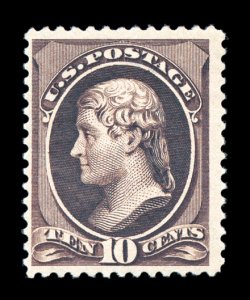 150 og 209b image#209b, 10c Black brown, a highly collectable example of this rare and often misidentified shade, possessing deep luxuriant color in the unmistakable black brown color, intense impression, nicely centered within large margins, very fine; 2000 and 2004 PF certificates. (Image) $2,500.00