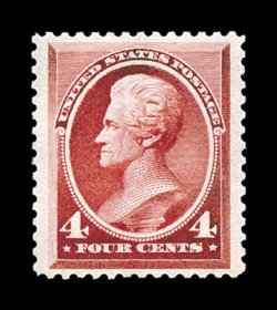 155 nh 215 image#215, 4c Carmine, a marvelous mint single, featuring incredibly wide margins and being remarkably well centered within them, deep luxuriant color and a well incised impression, o.g., n.h., extremely fine; actually a rare stamp to find in this stellar quality, particularly with margins this large; 1998 PF certificate. (Image) $800.00