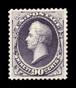 158 og 218 image#218, 90c Purple, an especially handsome mint single of this scarce high value, precisely centered within large margins, wonderfully rich color and a crisp detailed impression on fresh white paper, o.g., lightly hinged, extremely fine; 1987 PF certificate. (Image) $1,200.00
