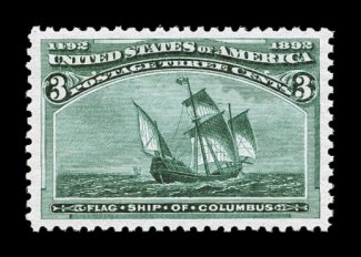 176 nh 232 image#232, 3c Columbian, a gem mint example which possesses exceptional physical attributes, including being perfectly centered within extraordinarily large margins, plus its color is strikingly rich and its impression razor sharp on immaculate white paper, pristine o.g., n.h., extremely fine; a marvelously handsome stamp; 1987 and 2004 PF certificates. (Image) $150.00