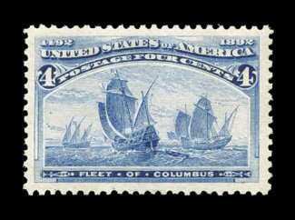 177 nh 233 image#233, 4c Columbian, a striking mint single, featuring margins of enormous size and being wonderfully well centered within them, lovely rich color on crisp paper, o.g., n.h., extremely fine and most impressive; 1999 PF certificate. (Image) $220.00