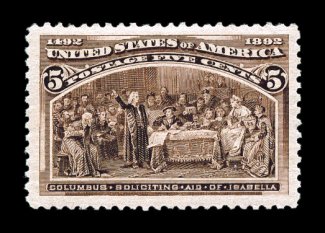 178 nh 234 image#234, 5c Columbian, a remarkable mint jumbo, being extraordinarily well centered within huge margins, sumptuously rich color and a crisp detailed impression, unblemished o.g., n.h., extremely fine; an eye-catching large margined gem; 1993 PSE and 2003 PF certificates. (Image) $250.00