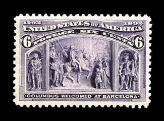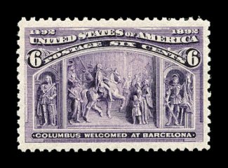 180 nh 235a image#235a, 6c Columbian, red violet, an outstanding mint single, being incredibly well centered within extravagantly large margins, beautiful rich color in the red violet shade, sharp impression on bright paper, pristine o.g., n.h., an extremely fine gem for the perfectionist; 1999 and 2004 PF certificates. (Image) $210.00