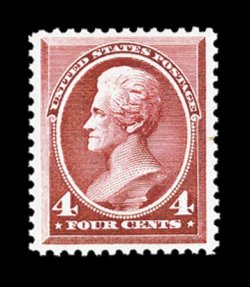 228 nh 219D image#219D, 2c Lake, impressive top right corner sheet-margin single, large to jumbo margins, especially intense deep and unmistakable lake color, o.g., stamp is never hinged, selvage with tiny thin specks, a very fine stamp with exceptional eye appeal; 2005 PF certificate. (Image) $800.00