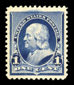 227 nhu 219 image#219, 1c Dull blue, jumbo-margined mint single, with exceptionally wide and beautifully balanced margins, intense rich color, full o.g., never hinged, extremely fine; 2006 PF certificate (XF 90; SMQ $270.00). (Image) $90.00