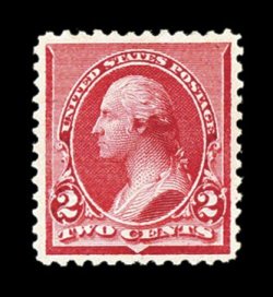 231 og 220c image#220c, 2c Carmine, cap on both "2's" variety, an exceptionally choice mint example of this scarce and popular variety, wonderfully well centered within uncharacteristically large margins, deep luxuriant color, o.g., lightly hinged, extremely fine; seldom offered in this premium condition; 1982 and 2006 PF certificates. (Image) $700.00