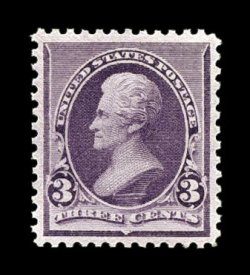 232 nhu 221 image#221, 3c Purple, essentially perfect centering, huge balanced margins all around, plus crisp even perforations, luxuriously rich color on immaculate paper, pristine o.g., n.h., extremely fine in every respect; an impressive large-margined gem; 1997 PF certificate and a 2006 PF certificate (XF-Superb 95; SMQ $2,250.00). (Image) $275.00
