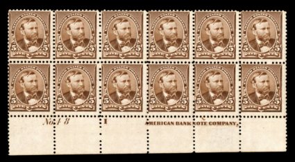 234 nhPB 223 image#223, 5c Chocolate, bottom margin imprint, letter "I" and plate "No. 48" block of twelve, strong color, o.g., never hinged, slight toning in the selvage, fine and seldom offered plate block; listed but not priced in Scott as never hinged. (Image) for hinged $3,190.00