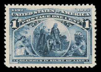 240 nhu 230 image#230, 1c Columbian, jumbo mint single, with four enormous margins and being perfectly centered within them, intense color in a deep shade, crisp impression as well on fresh white paper, o.g., n.h., extremely fine; a striking gem; 1996 PF certificate and a 2006 PSE certificate (XF-Superb 95 Jumbo; SMQ $475.00 for 95, $1,800.00 for 98). (Image) $57.50